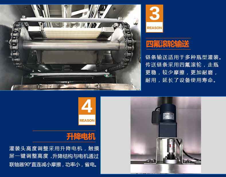 2、鏈條輸送適用于多種瓶型灌裝。傳送鏈條采用四氟滾輪,走瓶更穩(wěn),較少摩擦,更加耐磨,耐用,延長(zhǎng)了設(shè)備使用壽命。增加卡瓶口裝置:方便瓶口小的容器灌裝,灌裝頭和瓶口的定位更準(zhǔn)確;采用O型擋板,屏蔽漲緊輪的弊端(采用魚眼調(diào)節(jié)鏈輪的松緊度),輸送采用四氟滾輪式,容器輸送更平穩(wěn),可正反轉(zhuǎn)輸送;