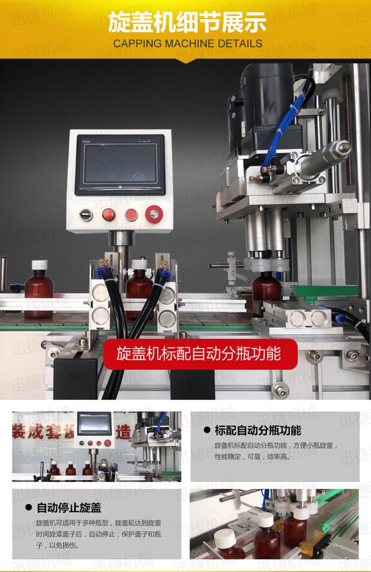旋蓋優(yōu)勢有:旋蓋機擁有做到自動分瓶功能,當瓶蓋旋緊時可自動停止旋蓋,保護了蓋子和瓶子免受損傷。塑料瓶消毒水灌裝機(小玻璃瓶溶液灌裝機)整機由304不銹鋼材質(zhì)組成,灌裝效率和精度高,雙重保證您的物料的包裝效果。