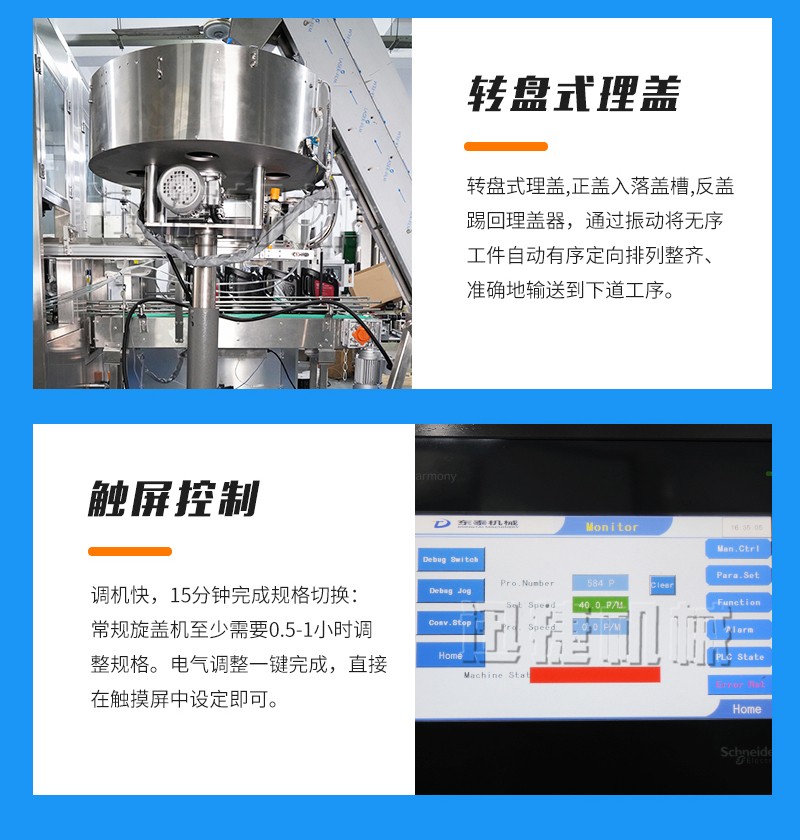 2、品質(zhì)高:跟隨式旋蓋,旋蓋過(guò)程不停頓,不晃液,不污染瓶口、瓶身及輸送帶,確