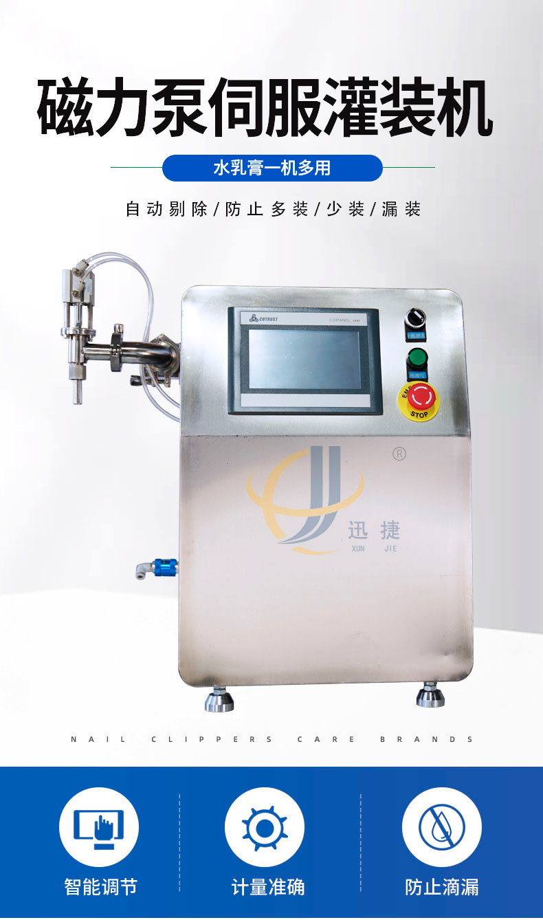 1.本機(jī)采用伺服電機(jī)驅(qū)動(dòng),PLC和觸摸屏控制,316L材質(zhì)齒輪泵灌裝原理,適合日化、醫(yī)藥、食品、油脂等各類流體和半流體物料定量灌裝。2.灌裝量通過(guò)觸摸屏調(diào)節(jié),灌裝量調(diào)節(jié)無(wú)上限,泵頭易拆裝易清洗,非常適合產(chǎn)品種類多,需要經(jīng)常調(diào)節(jié)范圍的用戶。3.計(jì)量準(zhǔn)確,灌裝100ML,可以實(shí)現(xiàn)不大于0.5ML的誤差。