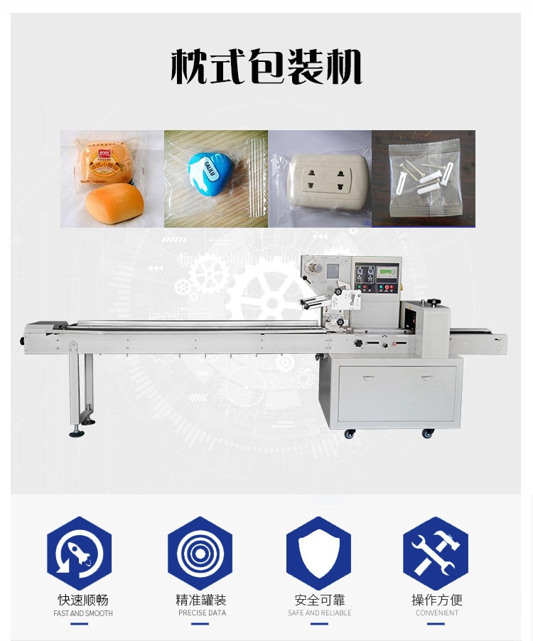 枕式包裝機(jī)可用于餅干、月餅、蛋黃派、米餅、雪糕、方便面、巧克力等塊狀產(chǎn)品的包裝,特別適合于小批量單一產(chǎn)品的包裝。
