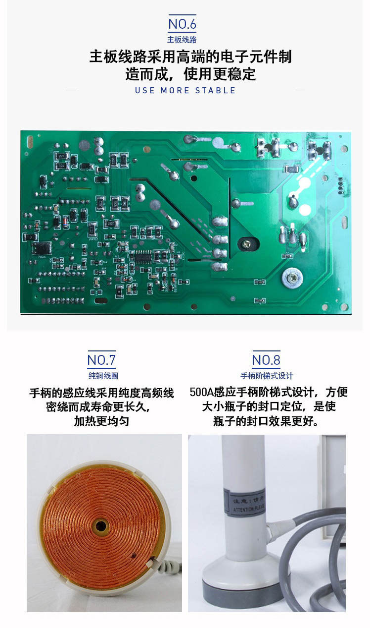 本機(jī)采用國(guó)外先進(jìn)線路,選用日本新模塊化功率器件,較于一般電子感應(yīng)加熱器更省電,熱效率達(dá)到90%以上,瞬時(shí)加熱速度為后者的20-30倍,因此不僅 適用于熱封性能較好的聚乙烯、聚丙烯材質(zhì)的瓶體,而且對(duì)熱封性能較差的聚酯瓶、玻璃瓶也有極好的封口效果。